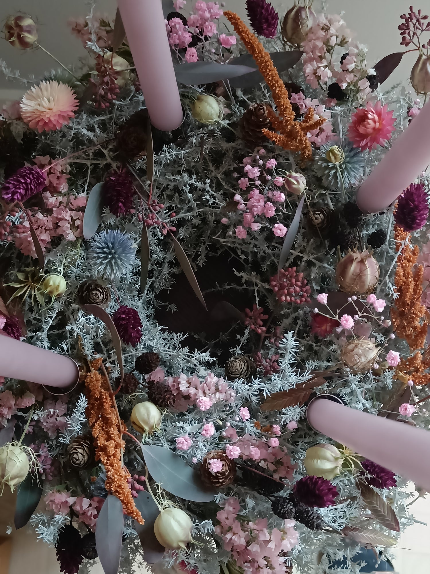 Smukke rosa nuancer I samklang med helt mørkebrune toner som giver den smukkeste kontrast. Kransen er lavet på en krans af Asparagus. Kransen stikker, så man skal lige passe på hænderne 🌲