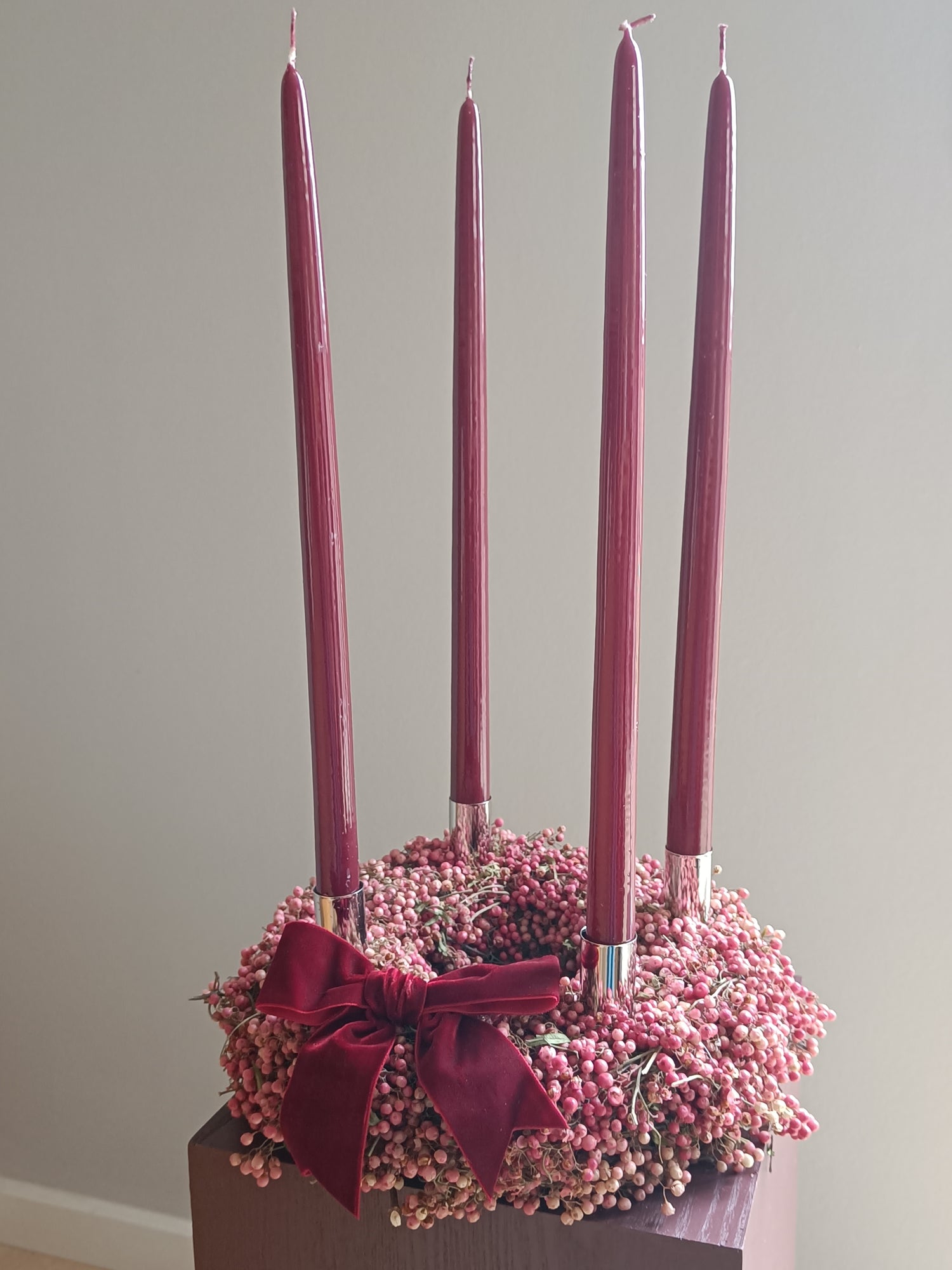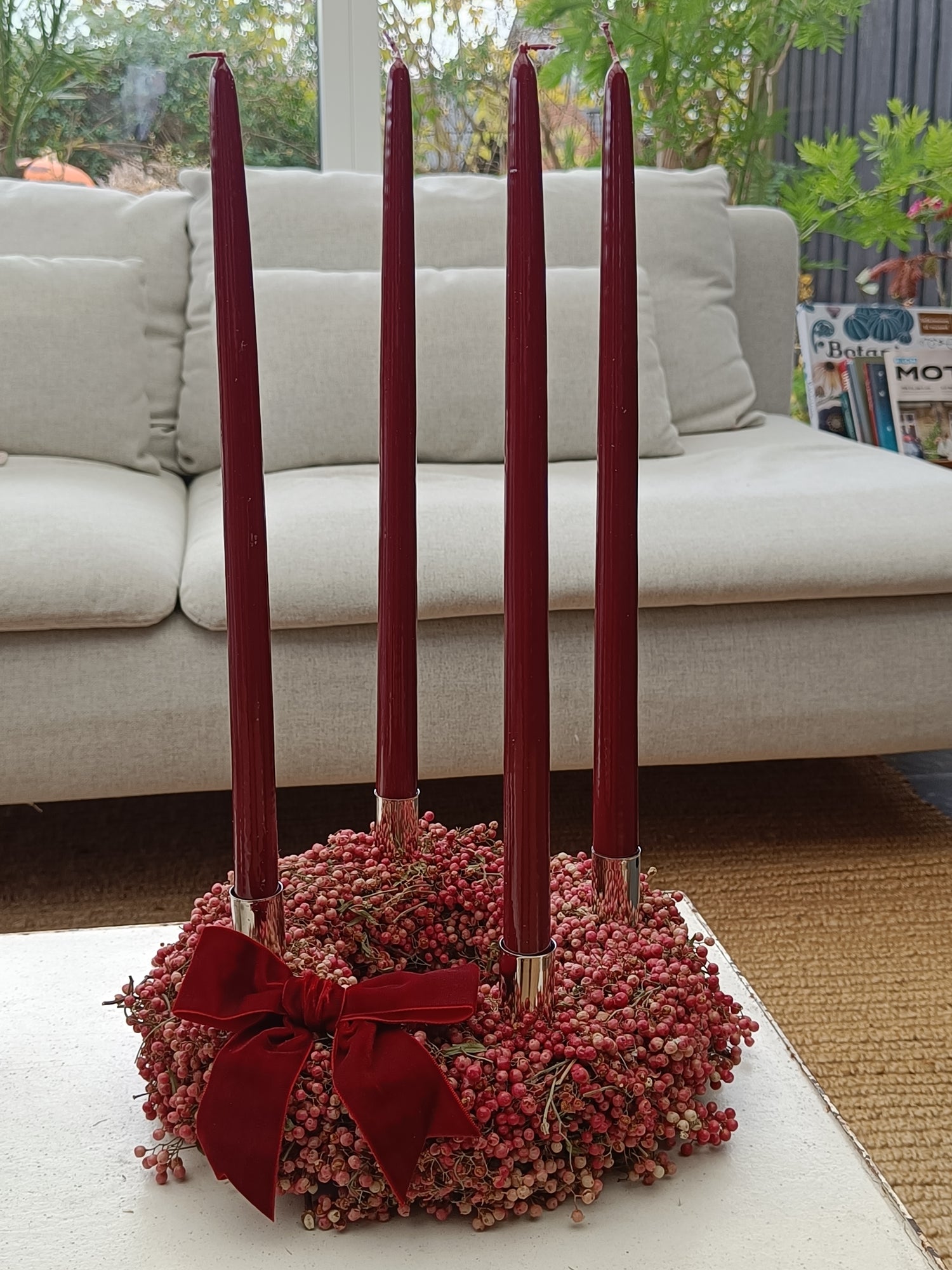 Smuk enkel adventskrans på en paberkrans. 4 laklys og en stor smuk sløjfe. Enkelt og smukt 👌