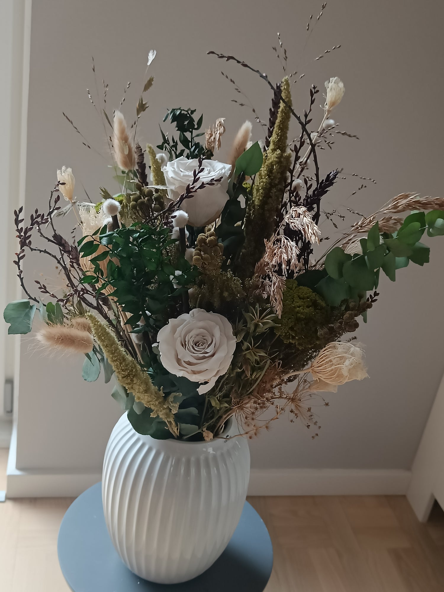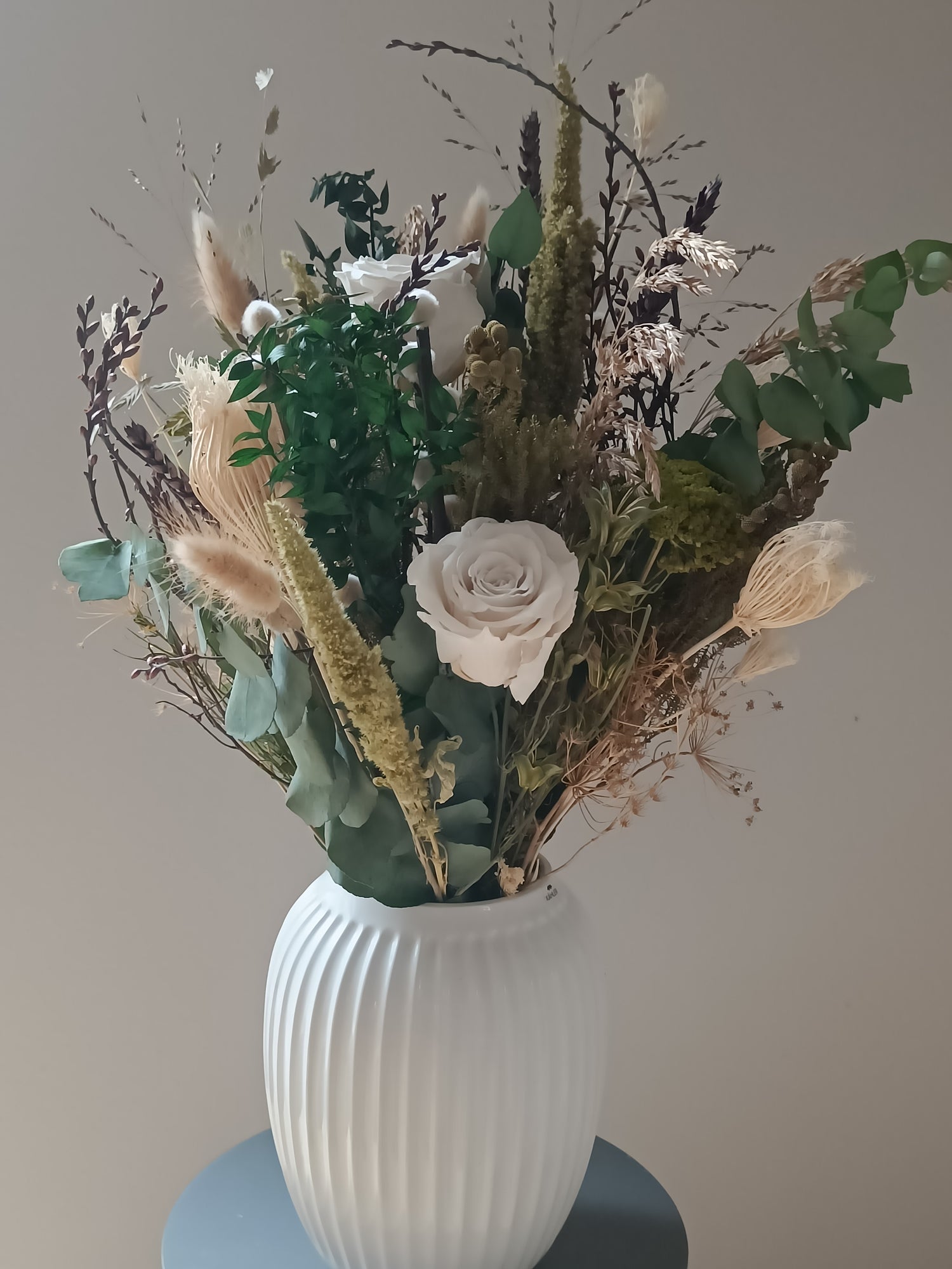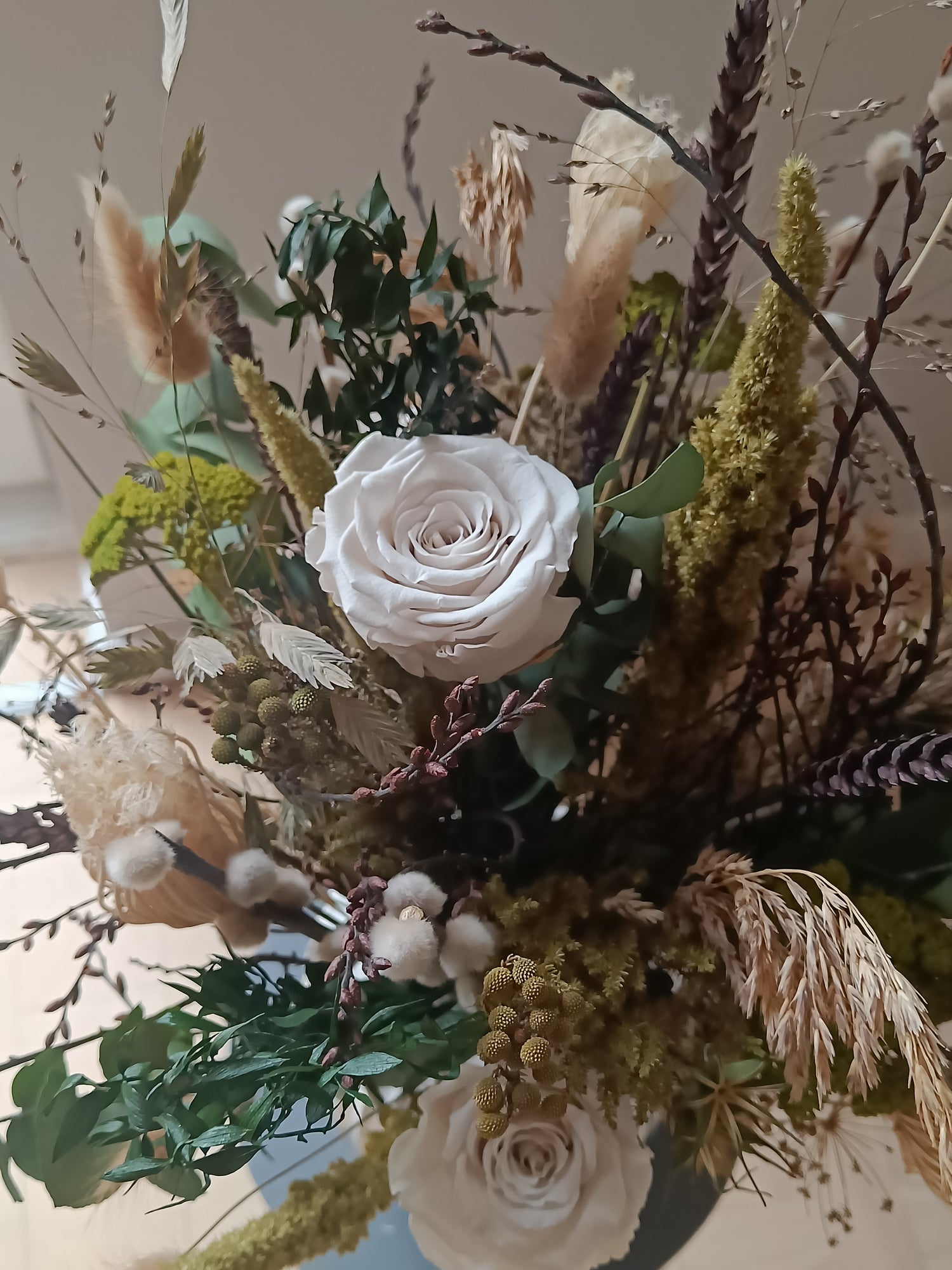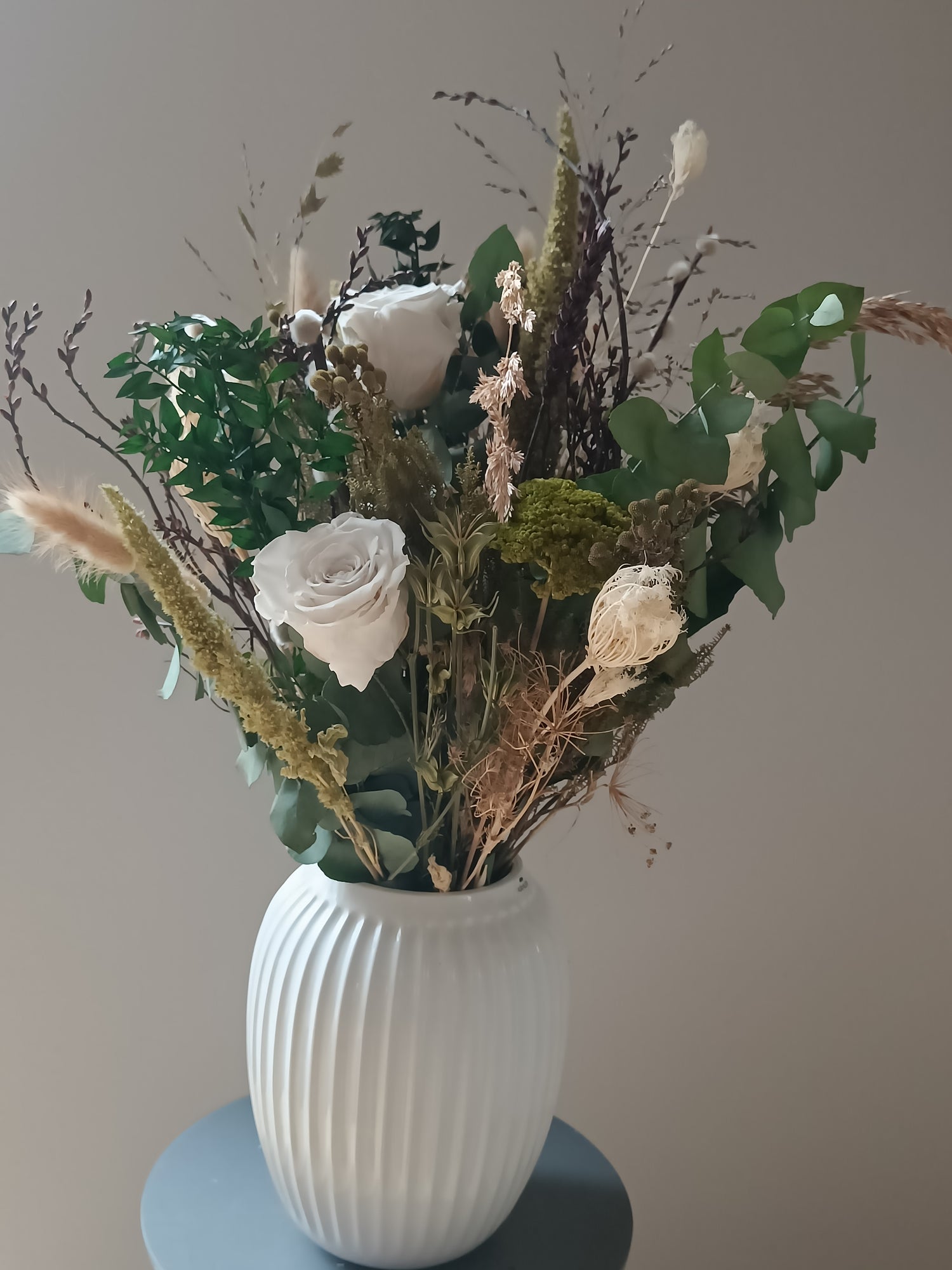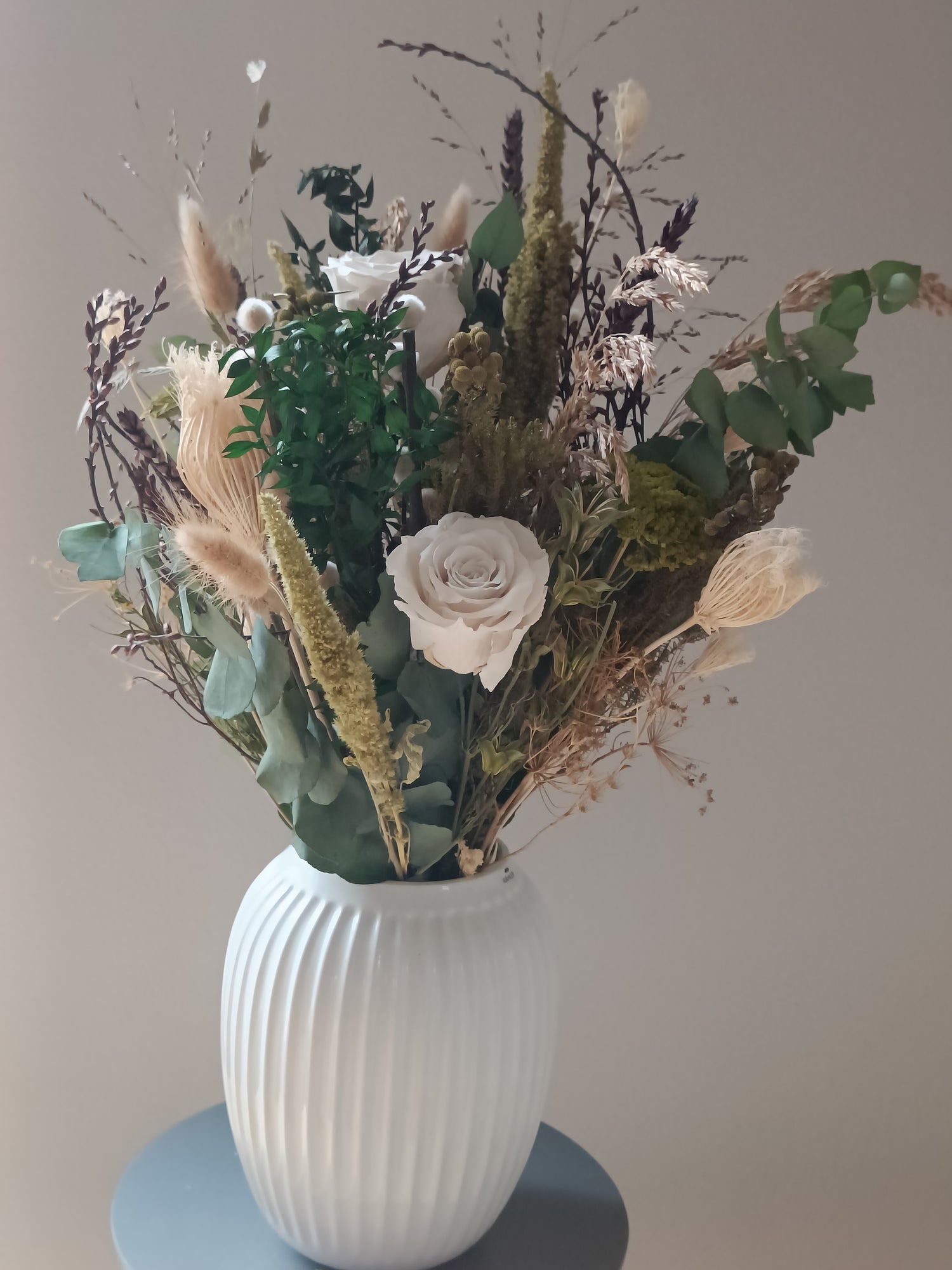Brune, grønne og hvide nuancer med forskellige materialer 🌿 indeholder 3 hvide præserveret roser.