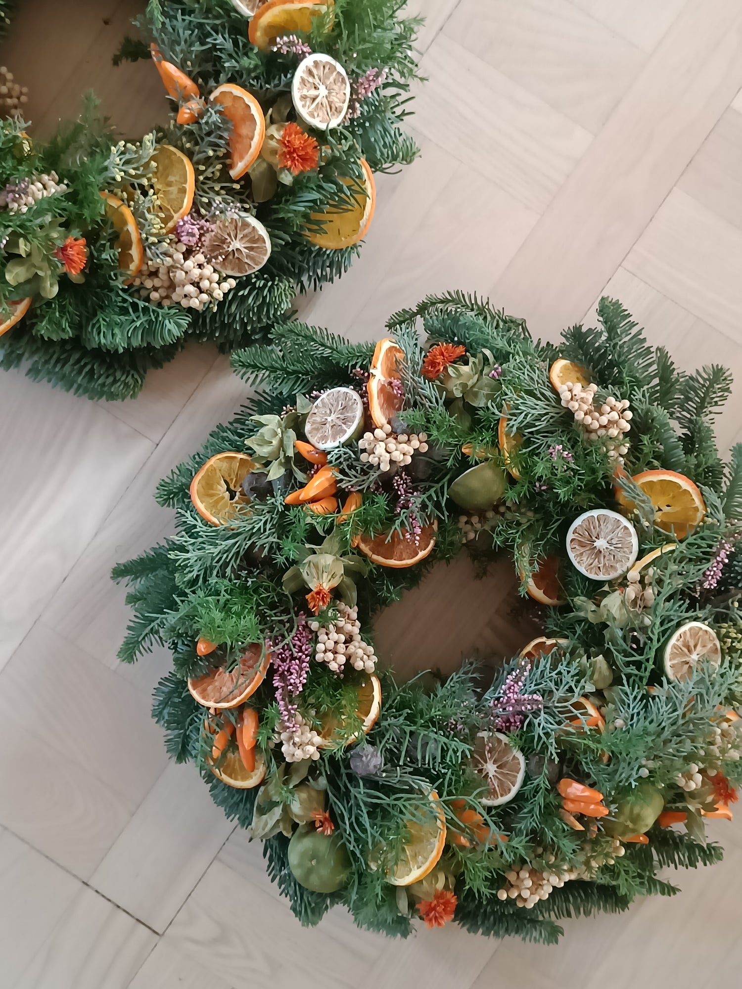 En smuk krans der er lavet af forskellige friske graner, tørrede appelsin, grape Og lime.